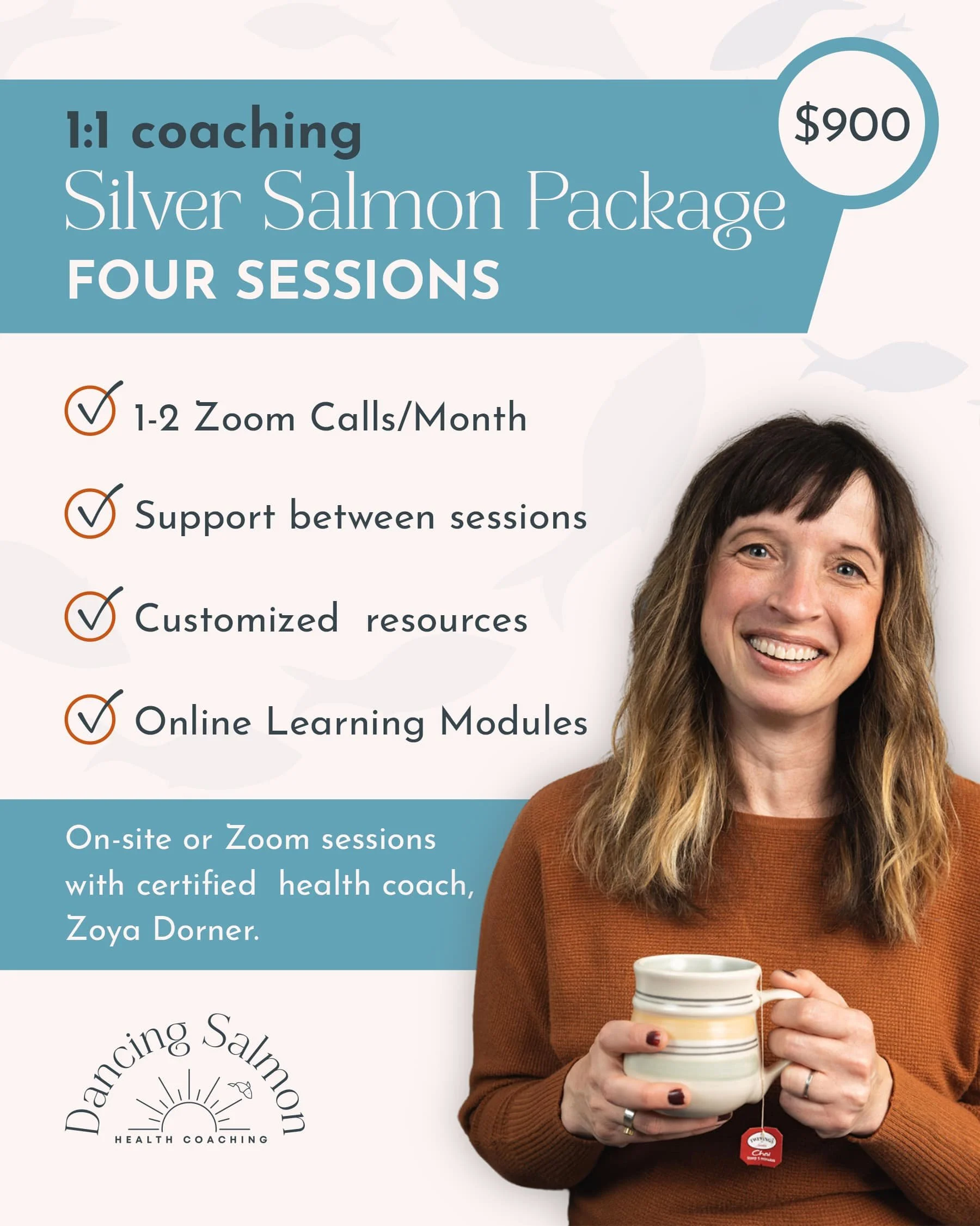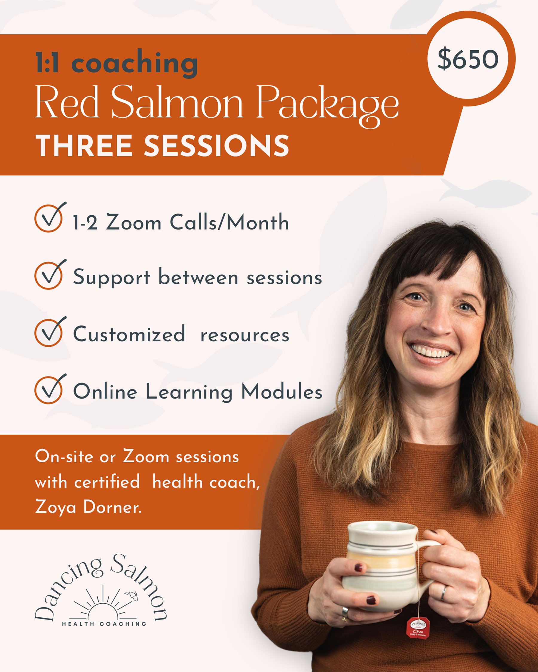 Dancing Salmon Health Coaching offers 1:1 coaching packages designed to support women through the transitions of perimenopause and menopause.